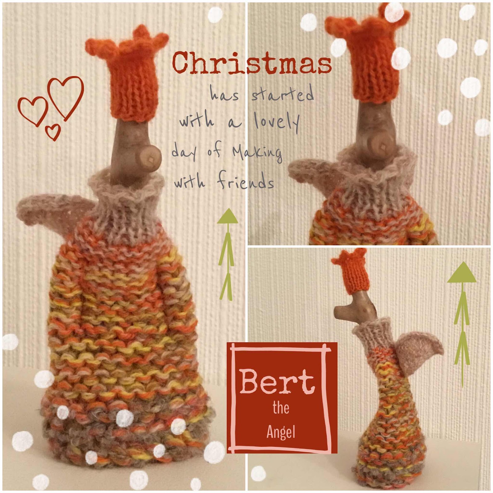 I’ve made the little Driftwood people before but the Angel is a new addition to the workshops that Liz runs. It’s a strange thing but although the Driftwood Folk are very simple in design, just a knitted dress/tunic with a driftwood stick for a head and usually some form of head gear; each character is unique. All the Angel's on the day of the workshop were similar but each one, distinctive. It’s the ‘heads’ that start to form the character.